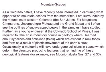 Whether you are looking through this portfolio because you have an interest in obtaining a print or you are just as fascinated as I am, by the varied and detailed structures, I hope you enjoy looking through my portfolio. I hope you come back frequently as I will update the site as new iron-meteorites are obtained and new samples are prepared.